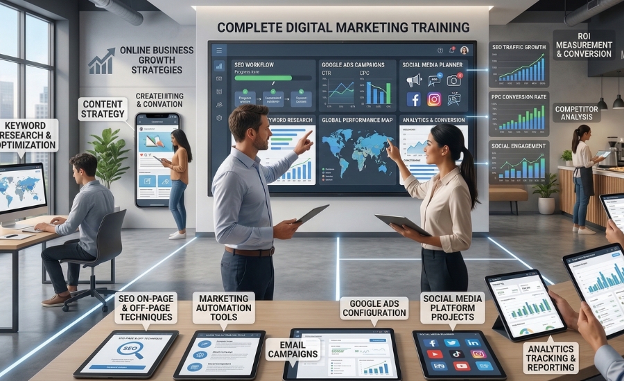 The Digital Marketing training teaches students to drive online business growth using modern marketing strategies. Topics include SEO, SEM, Google Ads, social media marketing, content strategy, and email campaigns.