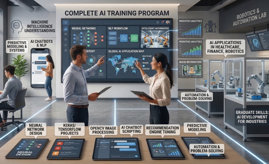 The AI training provides an understanding of machine intelligence and smart systems. Students learn AI algorithms, neural networks, natural language processing, and intelligent automation.